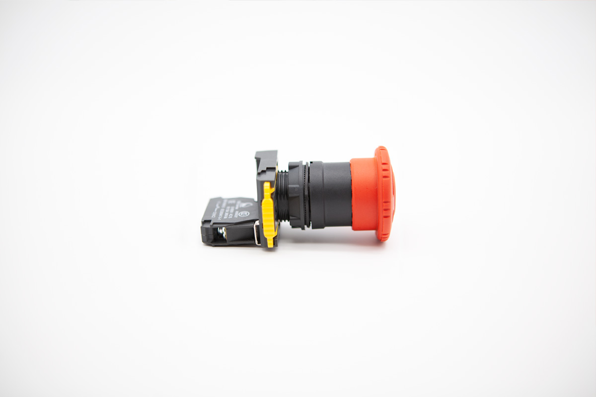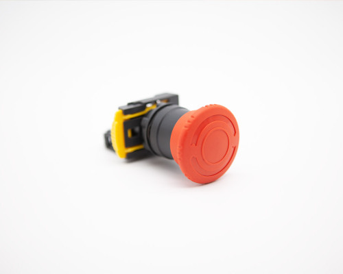 緊急停止按紐是謂當機台或控制系統遇到緊急事故時,可按壓緊急停止按紐,來阻斷控制電源及馬達停止,倘若需復歸時,該按鈕稍微旋轉即可復歸